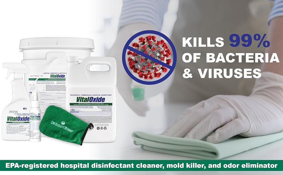 Vital Oxide is an EPA registered hospital disinfectant cleaner, mold and mildew killer and odor eliminator. Designed to be gentle to users but tough on germs, Vital Oxide is non-irritating to skin, non-corrosive to most treated articles, NSF-certified (no rinse required) for food-contact surfaces, and listed as a category IV (lowest toxicity category) pesticide with the EPA. We use this in the bathroom to fight odors, and to keep germs, mold and mildew away.
